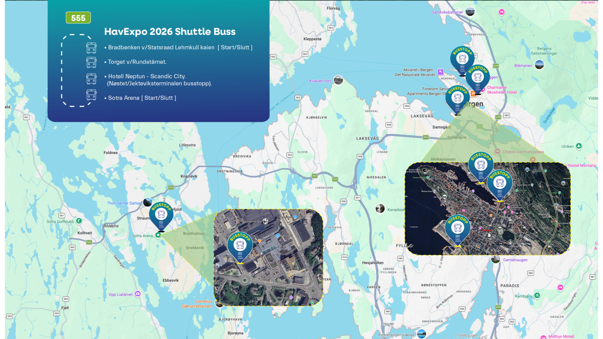 Det er enkelt å komme til HavExpo. Vi har satt opp gratis shuttlebusser fra flyplassen og Bergen sentrum. Shuttlebussene er gratis, og kjører deg helt til døren.